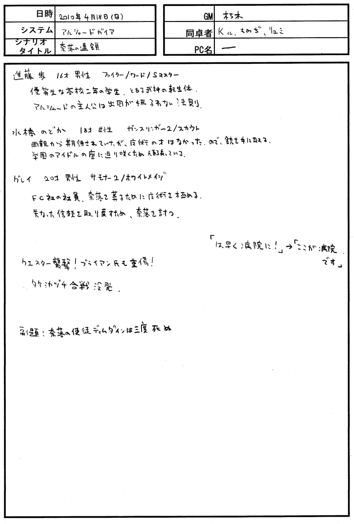 シナリオは07年2月コンで使用するはずだった予備卓用のもの。